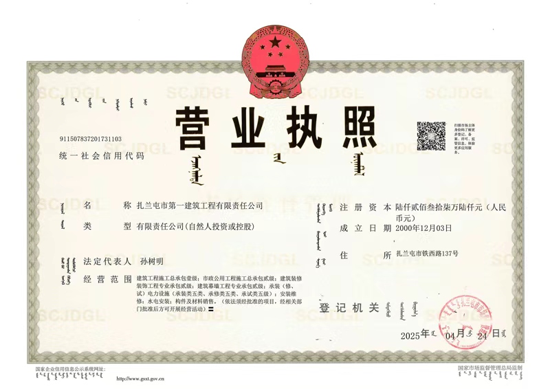公司的前身是扎蘭屯市第一建筑工程公司,始建于1958年3月1日。2000年12月轉制為有限責任公司,是房屋建筑工程施工總承包壹級、房地產開發貳級、市政公用工程施工總承包貳級、商品砼攪拌站、建筑裝修裝飾工程專業承包貳級、起重設備安裝工程專業承包貳級企業。具有建筑、房地產開發、市政工程、商品砼、裝修裝飾等工程的綜合施工能力。公司有五十余年的建筑施工管理經驗。